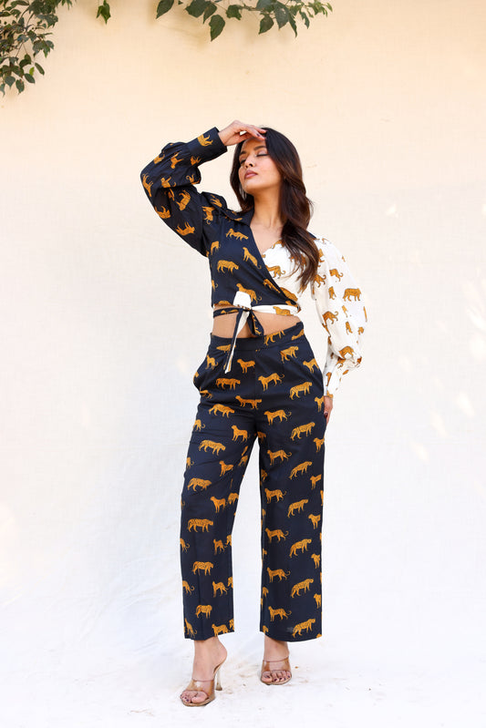 Tiger print overlapped tie knot crop top with pants set