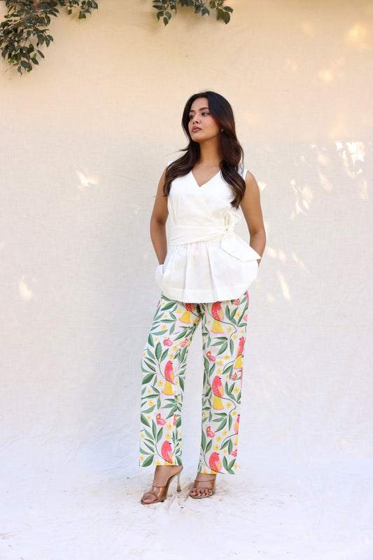 Sleeveless peplum top with tie knot belt with printed pants set