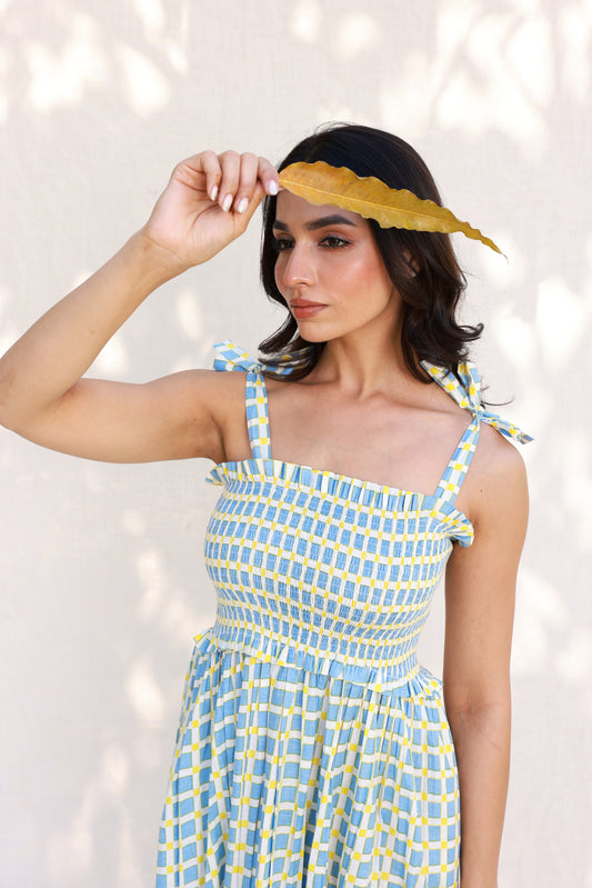 Blue Checkered Maxi Dress with Shoulder Straps and Knot Details