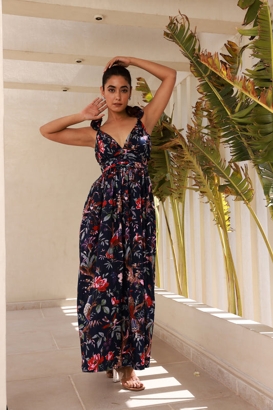 Criss-Cross Maxi Dress with Dark Blue Print and Black Strappy Details