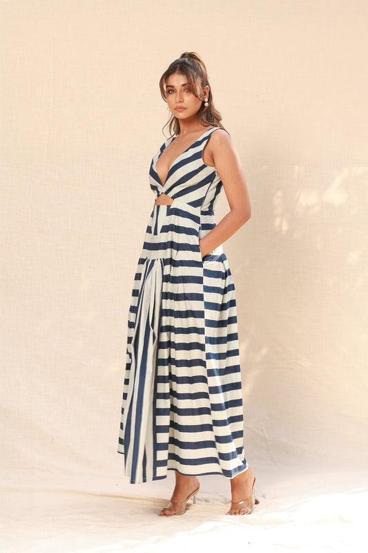 Blue Stripped Centre Front Gathered Waist cut-out Flarred Maxi