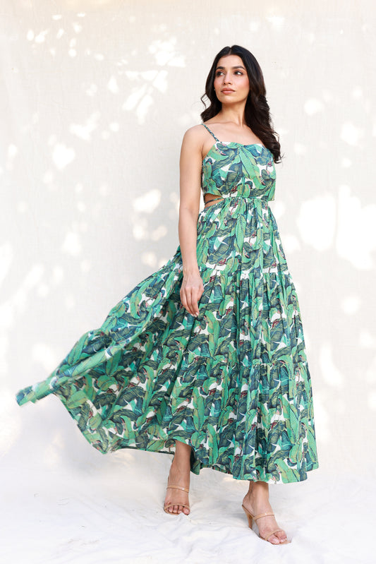 Green Maxi Dress with Banana Leaf Print and Waist-Cut Design