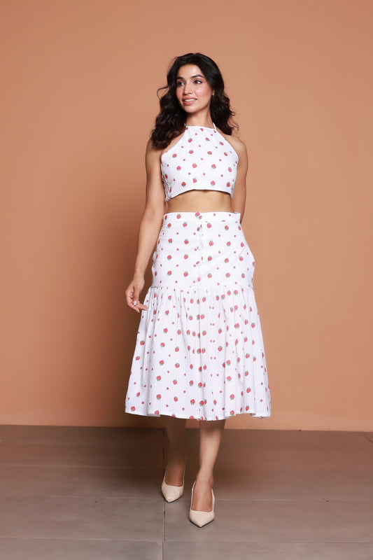 Strawberry Print Halter Neck Crop Top with Fit & Flared Skirt Co-Ord Set