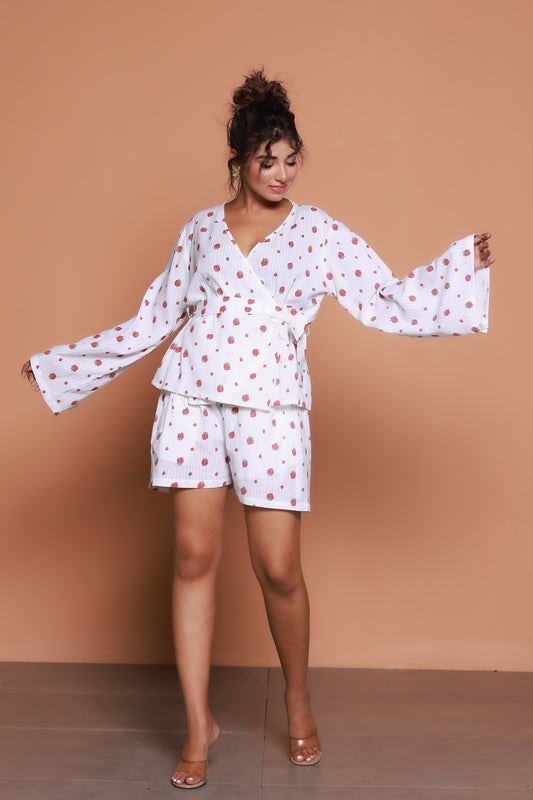 Strawberry Print Kimono Top with Shorts Co-Ord Set