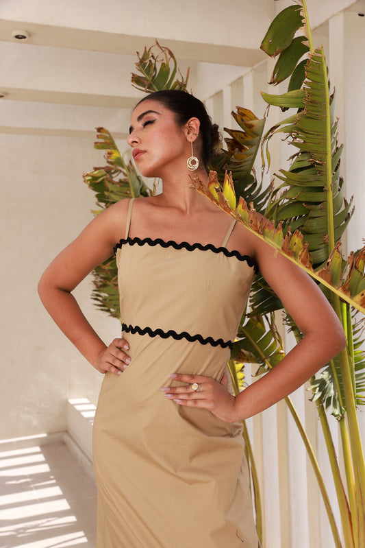 Beige A-Line Maxi Dress with Zic-Zac Contrast Lace