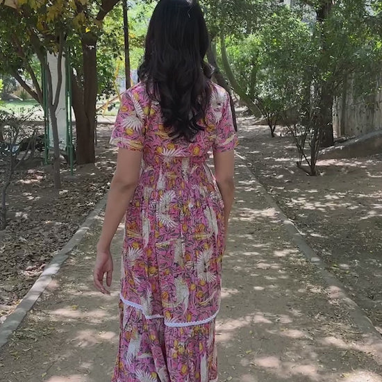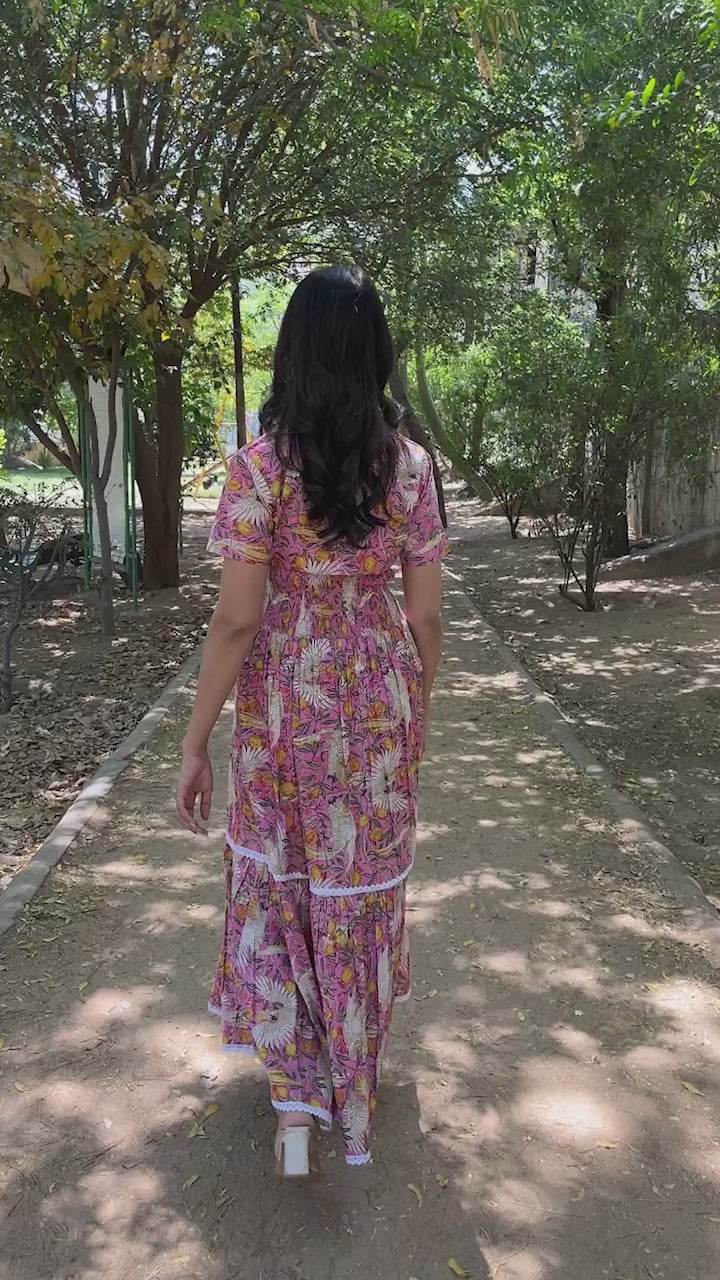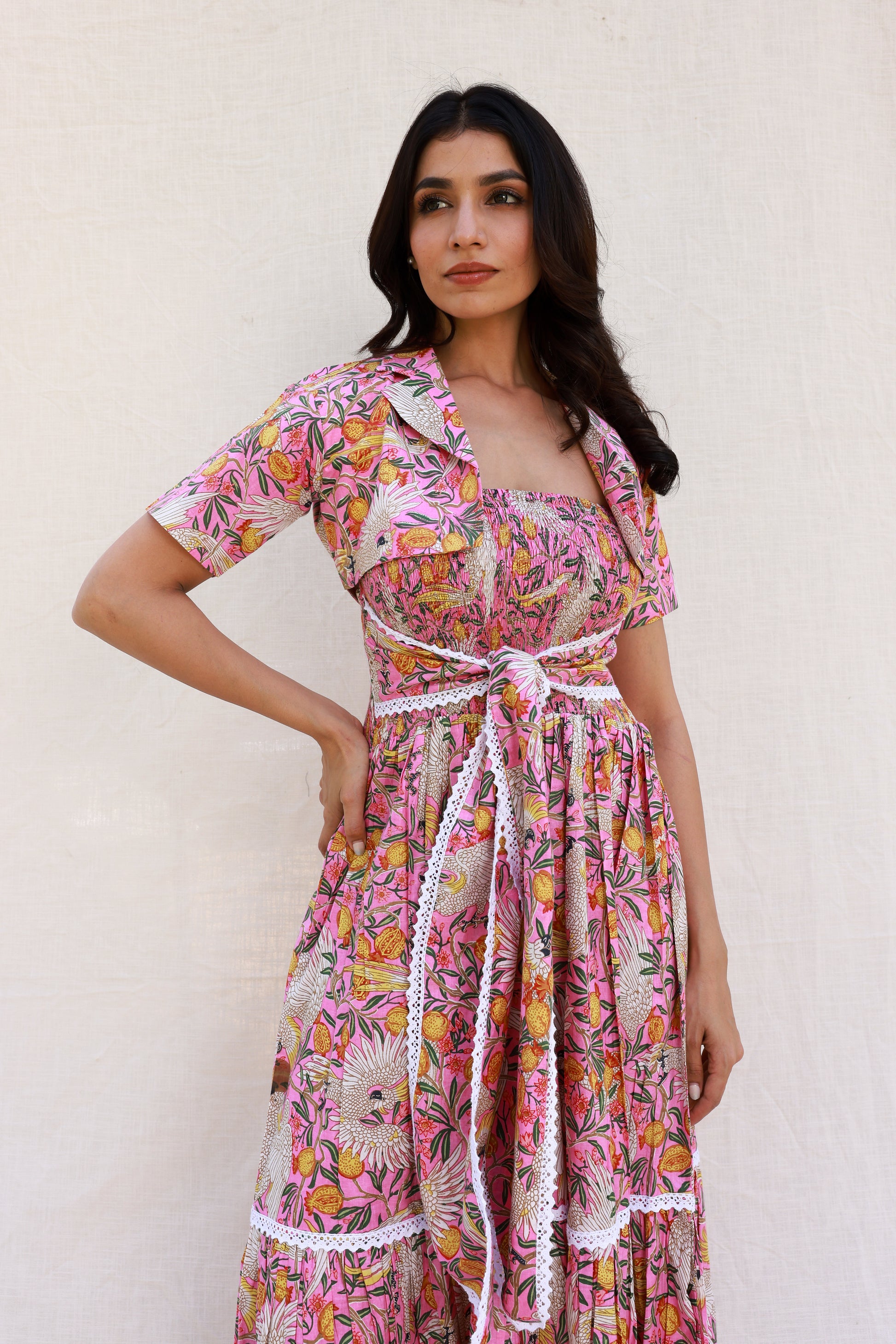 Pink Maxi Dress with Smocking and Tube Front Knot, Includes Cropped Jacket