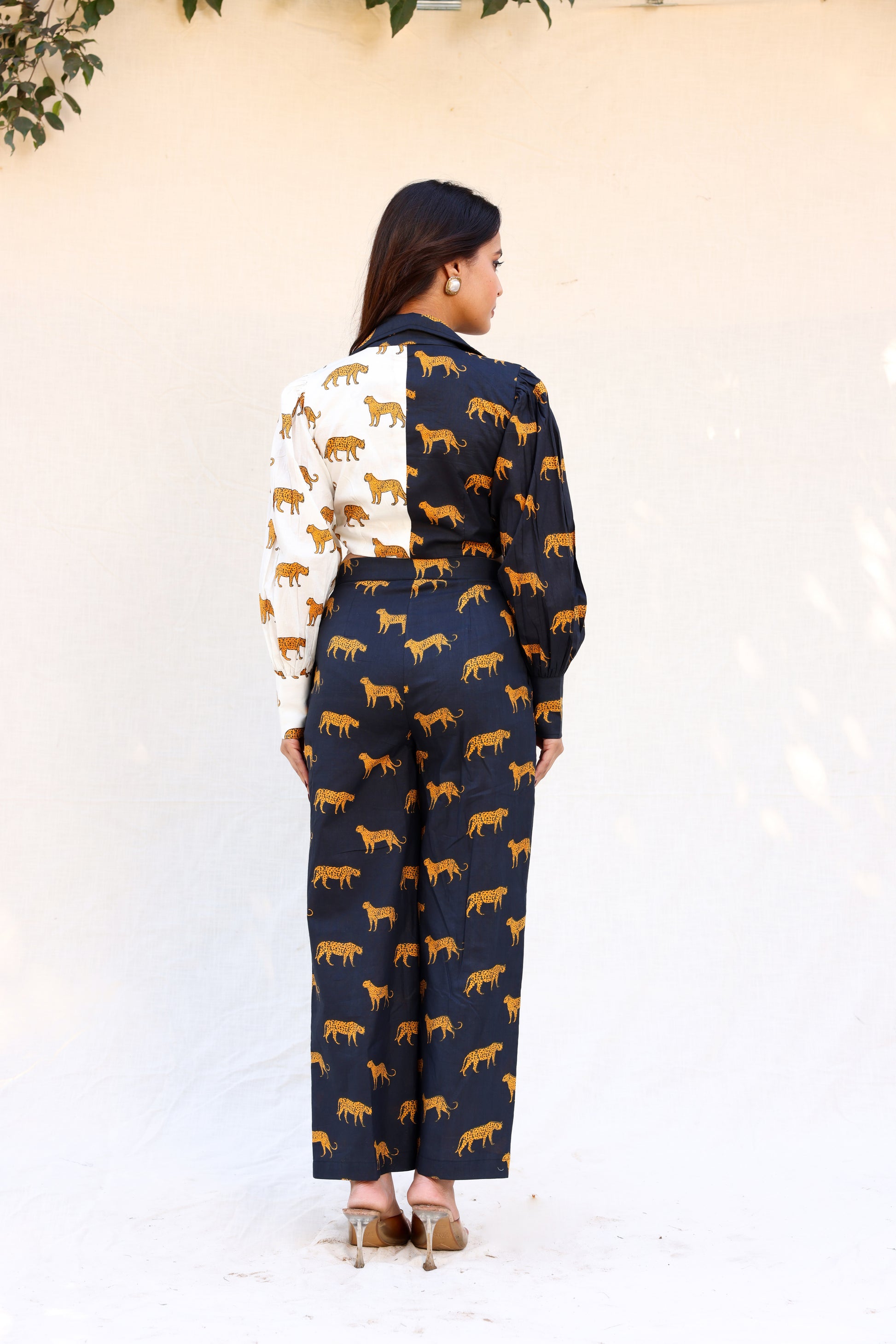 Tiger print overlapped tie knot crop top with pants set